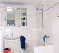 eingerichtete Badezimmer (weiß gefliest) ist die Wohnung